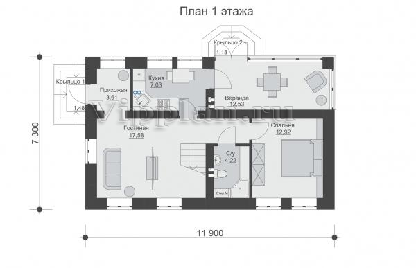 | Размеры дома: | 7.3м×11.9м |